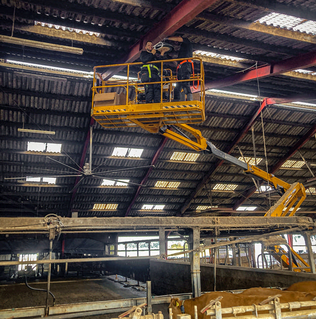 Det var ikke en opgave, man støder på hver dag. Armaturerne skulle udskiftes i hele seks meters højde – et arbejde, der krævede både teknik, præcision og tålmodighed. Fra seks meters højde udførte vores elektrikere arbejdet, med stalden under sig og køerne som publikum.