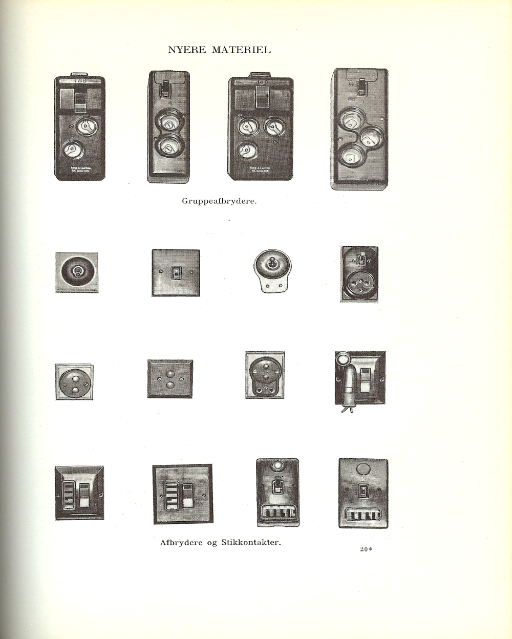 For den almindelige forbruger er afbrydere og stikkontakter det mest synlige, og de gennemgår i dette årti en gennemgribende udvikling. Fra vippe og drejekontakter af porcelæn og med messing dæksel går man over en periode over til kontakter af bakelit. Der er på dette tidspunkt to hovedfabrikater; Lauritz Knudsens (LK) vippekontakter og Nordisk Elektricitet Selskabs (NES) trykkontakter, men også installationsfirmaet Brix Pedersen (BP) har en import af en billig type kontakter, der navnlig bliver brugt i forbindelse med opførelse af større boligkomplekser. Denne import stoppede dog senere som følge af krigen, og gav dermed problemer i forbindelse med udskiftning, da de indmurede dåser ikke passer til de to andre typer kontakter.