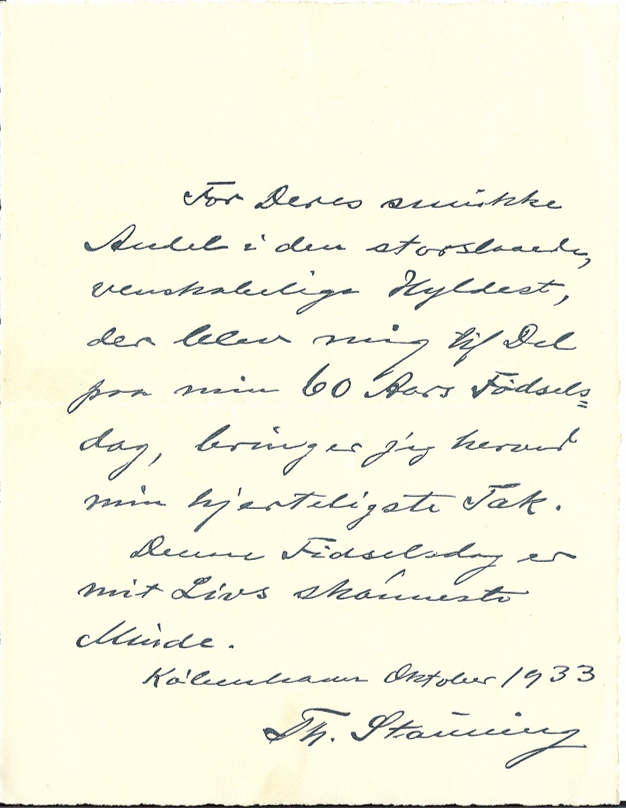Som tak for statsministerens indgriben året før, sender Peter Nielsen i 1933 en hilsen til Thorvald Stauning i anledning af dennes 60 års fødselsdag, og modtager endda dette fine brev retur.